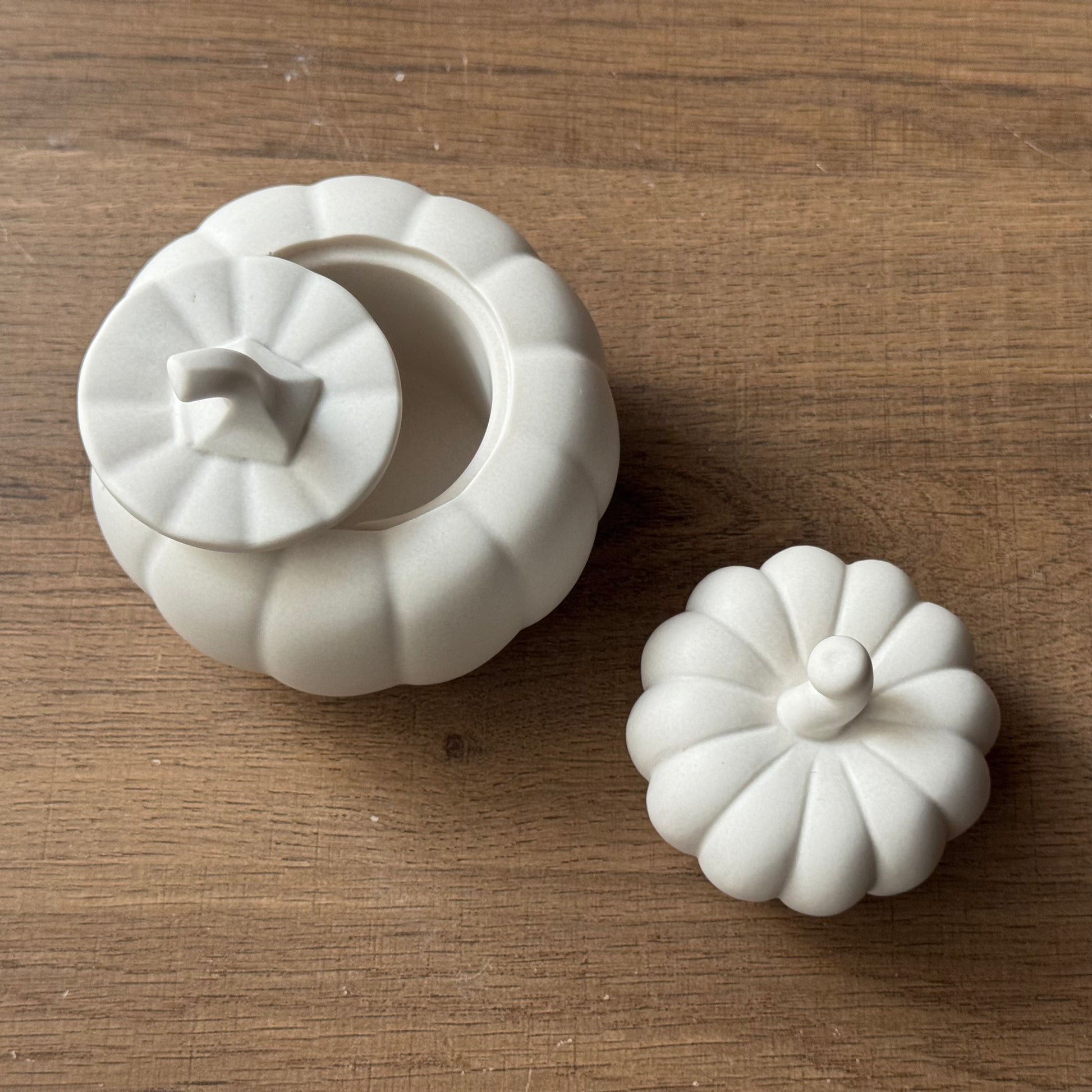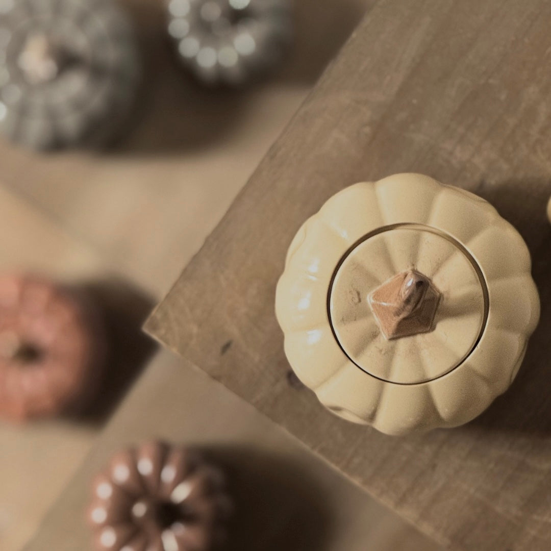 Een schattig setje bestaande uit een kleine decoratieve pompoen en een grotere pompoen die je ook kunt gebruiken als mini opbergpot.